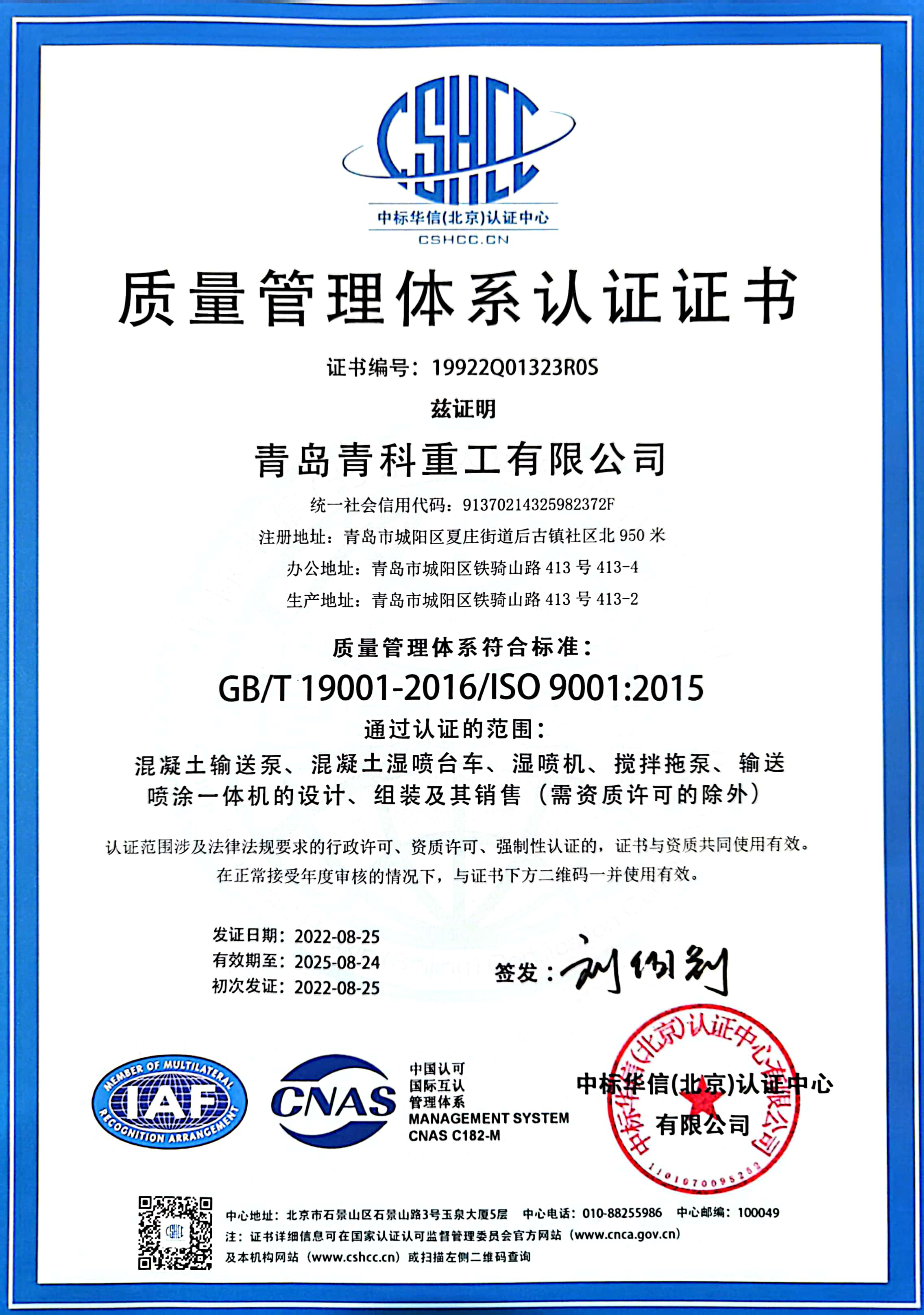 青島青科重工有限公司(青島科尼樂重工有限公司于2015年1月1日正式成立集團(tuán),并更名為青島科尼樂集團(tuán)有限公司,旗下有青島青科重工有限公司、青島輝特重工有限公司)是集科研、生產(chǎn)、銷售及售后服務(wù)于一體的專業(yè)研制大型建設(shè)工程機(jī)械設(shè)備的企業(yè),公司以人為本,科技興企,廣招高水平科技人才,積極引進(jìn)國(guó)內(nèi)外先進(jìn)技術(shù),采用特殊工藝和科學(xué)嚴(yán)格的檢測(cè)手段,使我公司的(D)HBT系列混凝土輸送泵、(D)XBS系列細(xì)石混凝土輸送泵、PJB系列噴漿泵、KOS污泥泵、SLJ上料機(jī)、JZC和JS系列混凝土攪拌機(jī)等產(chǎn)品,性能更加可靠,深受廣大建筑行業(yè)同仁的青睞。公司為國(guó)家AA級(jí)計(jì)量單位、國(guó)家AAA級(jí)質(zhì)量信的過單位、質(zhì)量保證先進(jìn)單位、消費(fèi)者滿意單位,建立并通過了ISO9001國(guó)際質(zhì)量體系認(rèn)證,二OO二年度被評(píng)為AAA級(jí)資信企業(yè),HBT混凝土輸送泵被中國(guó)質(zhì)量檢驗(yàn)協(xié)會(huì)授予“2001年國(guó)家質(zhì)量檢測(cè)合格—質(zhì)檢合格好產(chǎn)品”稱號(hào)。